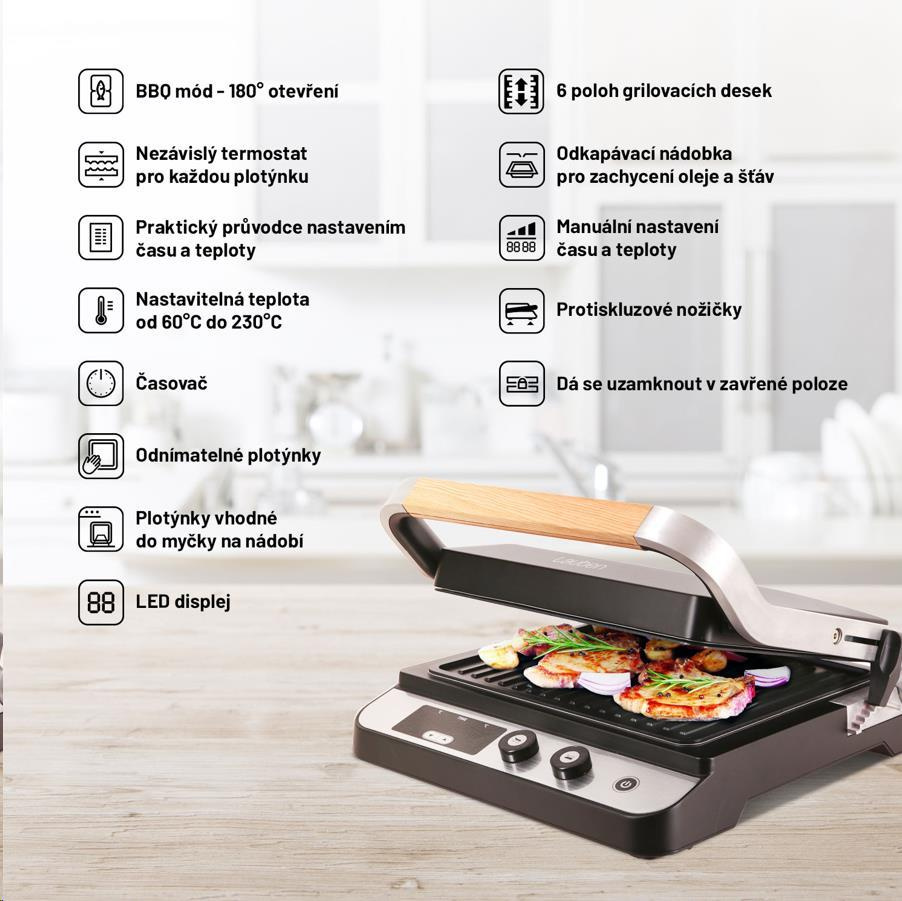 Zdravé grilování po celý rokKe slunným dnům letní sezóny neodmyslitelně patří venkovní grilování. S kontaktním grilem Lauben si ale můžete šťavnatý burger nebo čerstvou rybu vychutnat bez ohledu na počasí, kdykoli během roku. Tento flexibilní pomocník sjednocuje možnosti zapékacího kontaktního grilu a plnohodnotného stolního grilu. Je jen na vás, zda se rozhodnete připravit si rychlé domácí panini, nebo gril nastavíte do BBQ módu a uspořádáte večírek s grilováním pro přátele. Díky výkonu 2000 W si gril bez problému poradí i s prudkým opečením, které je potřeba u kvalitních steaků, disponuje dostatečnou grilovací plochou 1500 cm2, regulátorem teploty a časovačem. Plotýnky grilu jsou odnímatelné, každé z nich lze separátně nastavit teplota ohřevu a vy tak můžete připravovat různé druhy potravin zároveň. Teplota ohřevu lze nastavit v rozmezí od 60 do 230 °C, vhodnými teplotami pro jednotlivé druhy potravin vás provede přiložený průvodce. Součástí grilu je praktická miska na odkapávání přebytečného tuku a šťávy. Příjemným bonusem je kvalitní designové provedení vhodné do exteriéru i interiéru.