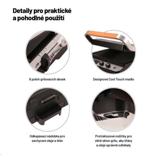 Plotýnky grilu mají nastavitelnou polohu. Můžete například upravit výšku a sklon plotýnky tak, aby se snížil tlak působící na křehké suroviny, jako jsou třeba čerstvé ryby. V BBQ módu si u každé z plotýnek můžete nastavit požadovanou teplotu ohřevu separátně. Se správnou volbou teploty pro jednotlivé druhy potravin vám pomůže přiložený průvodce. Zároveň si pro každý pokrm můžete nastavit požadovaný čas přípravy, takže se nemusíte bát, že netrefíte správný stupeň propečení. Gril je vybaven i funkcí automatického vypnutí, díky vysokému výkonu se velmi rychle rozehřeje a o průběhu přípravy máte přehled díky LED displeji. V nabídce jsou i ploché plotýnky pro ještě širší možnosti grilu.
