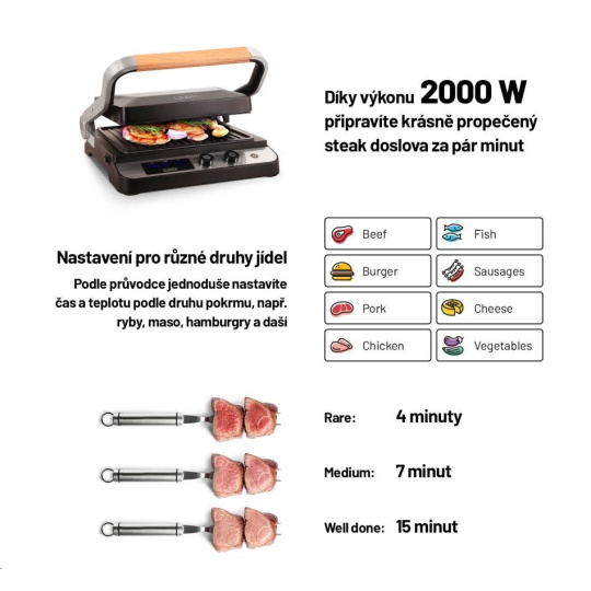 Gril se díky výkonu 2000 W rozehřeje velmi rychle a poradí si i se steaky, které vyžadují prudké opečení při vysoké teplotě.