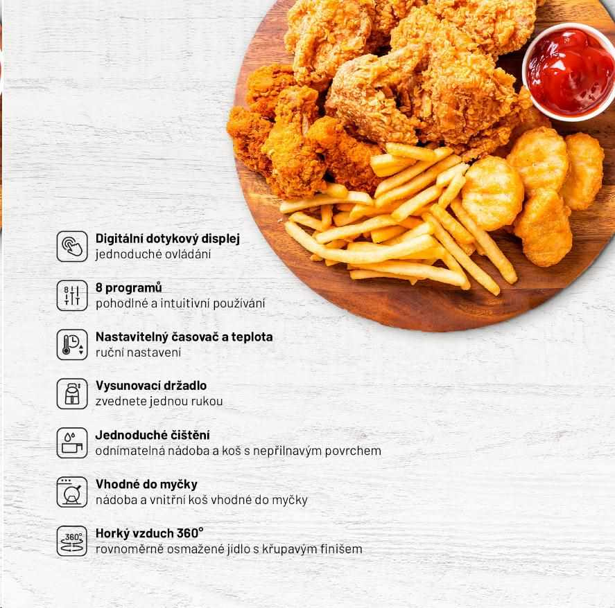 Ke smažení neodmyslitelně patří spousta tuku, a proto se této lákavé úpravě často vyhýbáme. S horkovzdušnou fritézou Lauben si můžete vychutnat své oblíbené jídlo s čistým svědomím. Díky 360° cirkulaci horkého vzduchu ho totiž připravíte i bez tuku. Jídlo tak nebude mastné, ale zároveň si zachová křupavost, chuť, vůni i správnou strukturu.