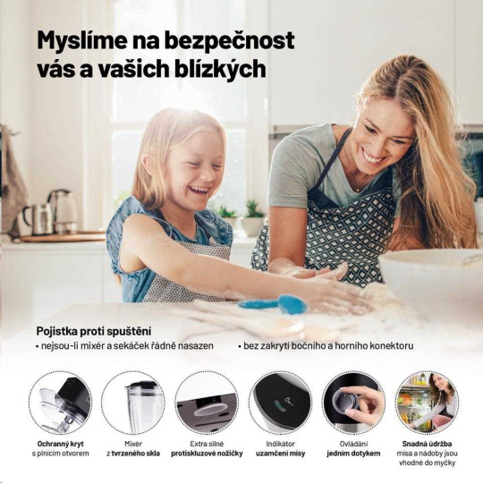 Hlavní nerezovou mísu, skleněný mixér a sekáček lze mýt v myčce nádobí.