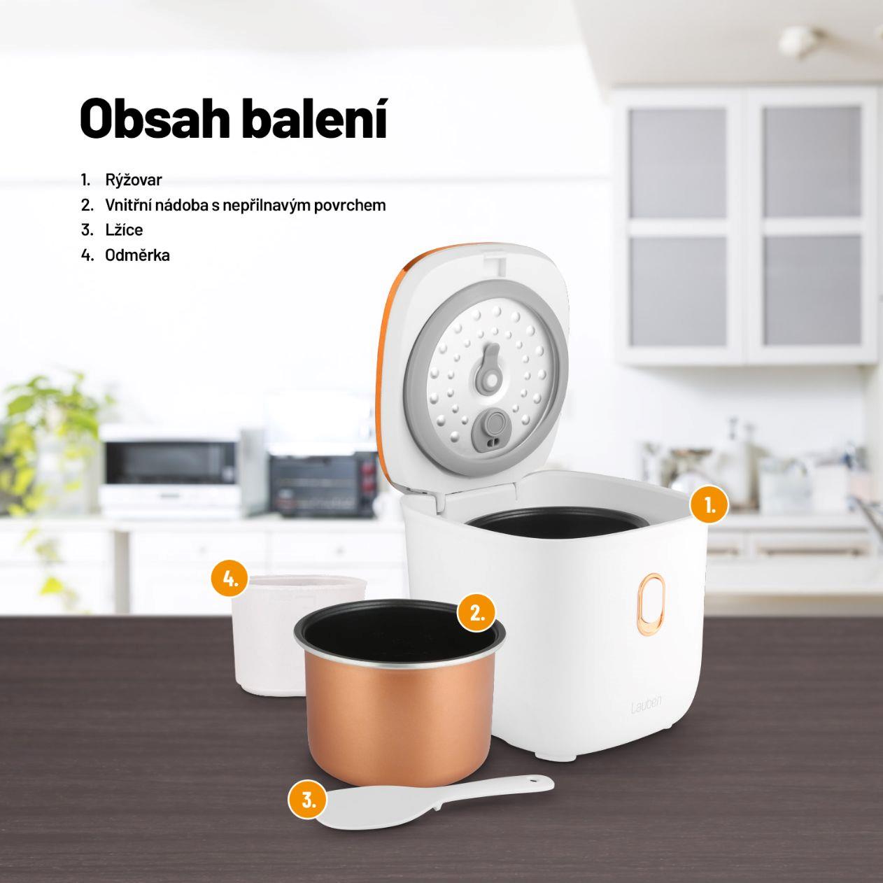 Vařte s lehkostí, chutně a stylověEfektivita, snadné použití a design mají společného jmenovatele, je jím víceúčelový rýžovar Lauben Multifunction Rice Cooker 1200WR Rose Gold Edition. Stiskem jediného tlačítka uvaří všechny druhy rýže na správnou tvrdost a 6 přednastavených funkcí vykouzlí další pokrmy jako kaše nebo polévky. Čas některých programů si však na intuitivním dotykovém displeji můžete nastavit i manuálně. Díky funkci odloženého startu lze mít jídlo připraveno už po návratu domů, opozdilci zase ocení funkci Keep Warm, která udrží pokrm teplý bez rozvaření. Porce nasytí jednotlivce i páry, jež pak mají více času pro sebe, protože ani údržba nezabere čas. Vnitřní hrnec lze dát do myčky. Bezpečné používání zajišťuje ochrana proti přetečení a technologie Cool Touch proti popálení. Rýžovar bude ozdobou každé kuchyně, kterou rozzáří trendy rose gold barvou, a přitom nezabere takřka žádné místo.