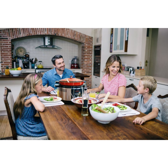 Součástí elektrického multicookeru je OvenSafe® litinový smaltovaný vnitřní hrnec, který odolává teplotám až 250°C a hodí se i pro použití v troubě či na různých typech sporáků. Litina oplývá schopností absorbovat teplo a předávat ho surovinám uvnitř, které se tak připravují při konstantní teplotě. Dochází k úspoře energie a tím i peněz. Šťavnatost a křupavost jídlům zajišťuje speciální poklice, která je navržena tak, aby docházelo k rovnoměrné distribuci vlhkosti uvnitř hrnce.