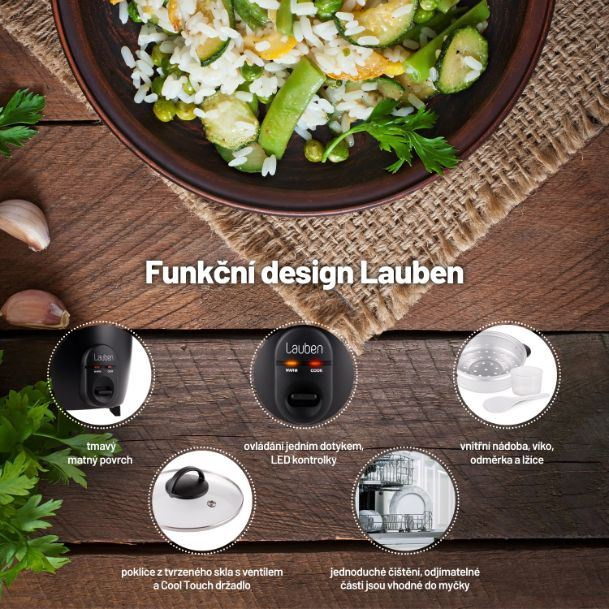 Oproti ostatním rýžovarům je Lauben Rice Cooker 600BC příkladem designu, který nejen dobře vypadá, ale i plní svou funkci. Poklice rýžovaru je z tvrzeného skla, tudíž máte lepší kontrolu nad stavem připravovaného jídla. Zároveň je opatřena otvorem pro únik přebytečné páry. Samozřejmostí jsou protiskluzové nožičky, díky kterým rýžovar vždy zůstane na svém místě. Povrch vnitřní nádoby rýžovaru je nepřilnavý, takže rýži můžete připravovat bez tuku, a přesto se nikdy nepřipálí. Technologie Cool touch zase zajistí, že se o něj nikdy nespálíte vy.