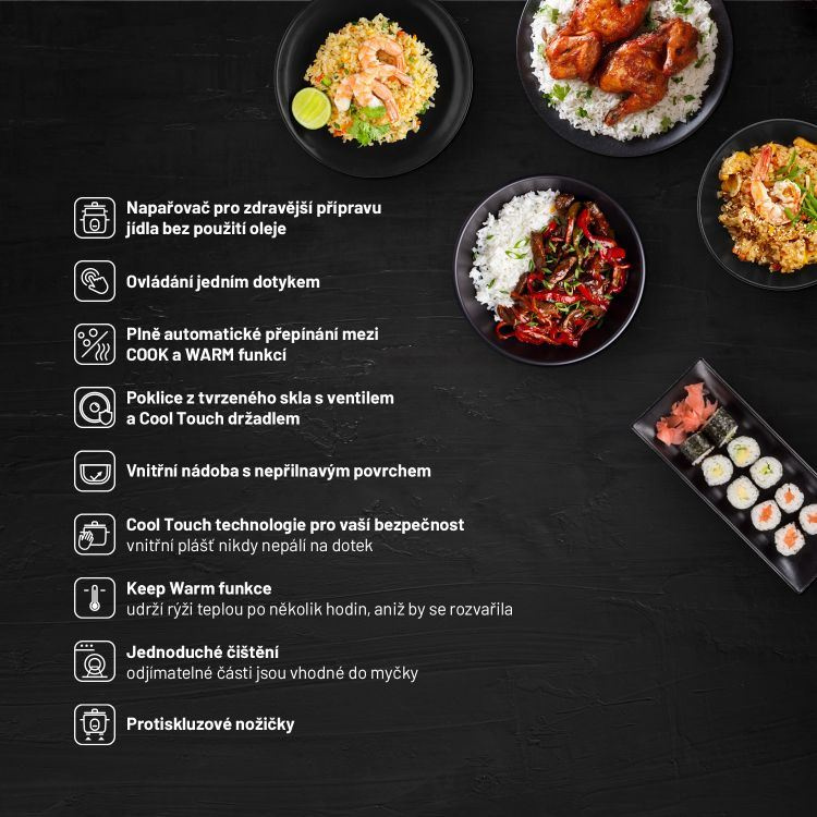 O vnější část rýžovaru se díky technologii Cool touch nikdy nespálíte.