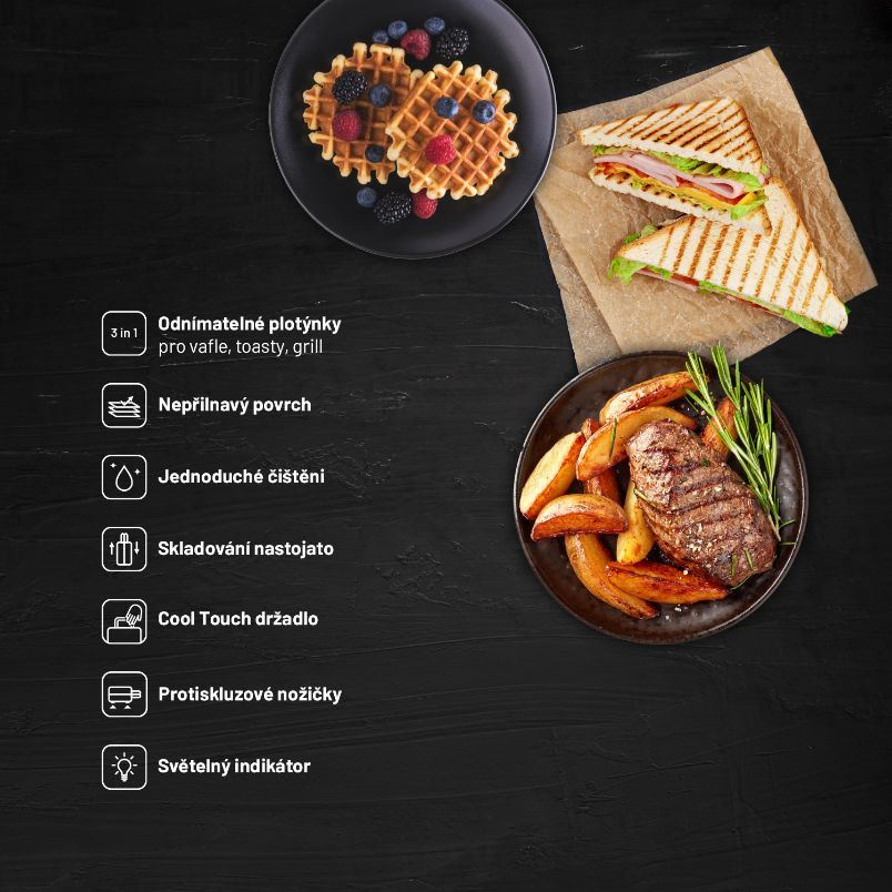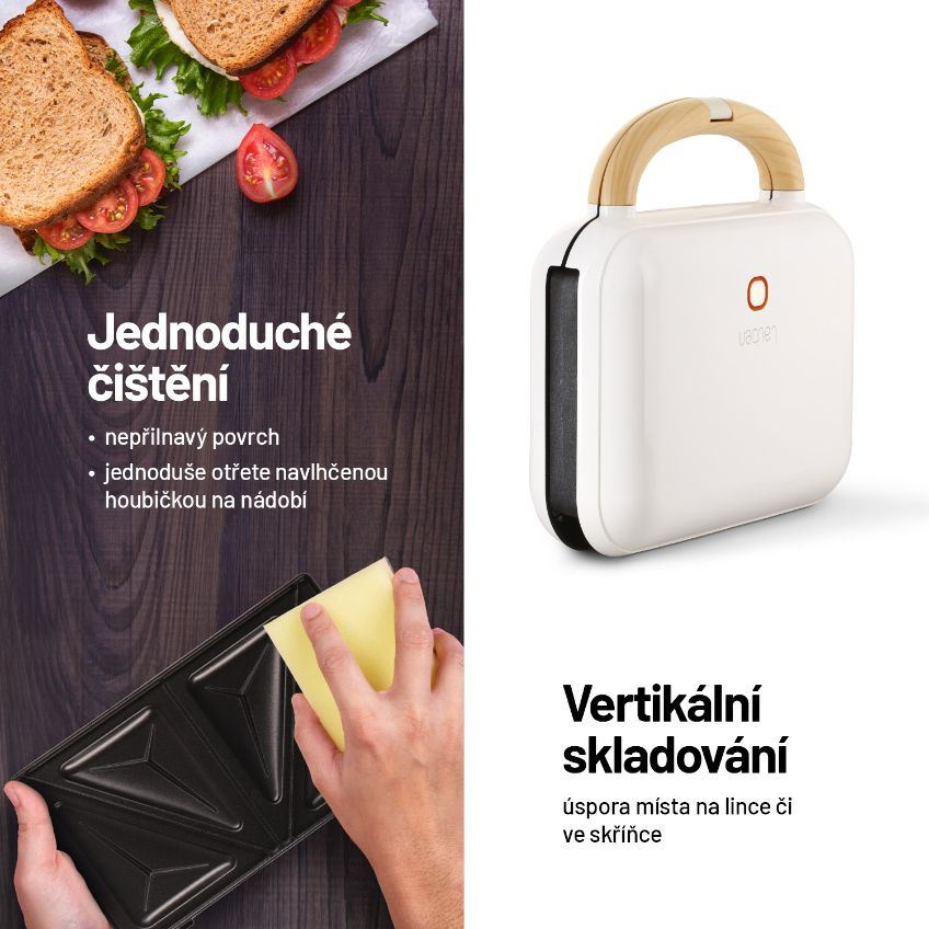 Křupavá snídaně, svačina i rychlá večeřeNemáte zrovna čas na přípravu teplé večeře nebo vydatné snídaně? S toastovačem Lauben zvládnete obojí během pár minut. Klasickými toasty se šunkou a sýrem potěšíte každé dítě, rozhodně u nich ale nemusíte skončit. Sendvičovač Lauben si díky 3 sadám plotýnek poradí i se snídaňovou vaflí nebo grilováním masa. Nahřejete ho během chvilky a jídlo budete mít hotové dříve, než se vám podaří svolat všechny ke stolu. Potěší vás i snadná údržba a skladování. Sendvičovač vertikálně uložíte do kuchyňské skříňky a vyměnitelné plotýnky lze jednoduše otřít hladkou stranou houbičky na nádobí. Díky integrovaným protiskluzovým nožkám zůstane během přípravy jídla na místě. Mysleli jsme i na bezpečný provoz. Cool Touch držadlo zajistí, že se nikdy nespálíte a provoz indikuje LED kontrolka na povrchu přístroje. Přidanou hodnotou je prémiový design značky Lauben. Trendy off white provedení s dřevěným dekorem se totiž skvěle hodí do každé kuchyně.