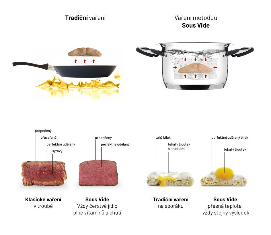 Metoda sous vide při vaření zachovává všechny živiny a vitaminy, k přípravě jídla nepotřebujete žádný tuk.