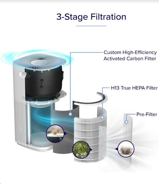 Poslední, vysoce efektivní karbonový filtr potom už jen odfiltruje kouř, pachy, výpary a jiné nejmenší částice. Celkově čistička Levoit CORE Core 600S zachytí až 99,99% všech nečistot, a to až do miniaturní velikosti 0,1 mikronů. Vám zůstane jenom čerstvý a čistý vzduch.