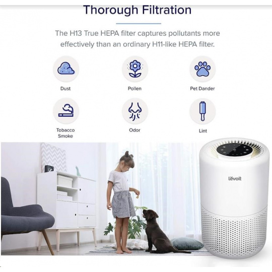 Druhou vrstvou je HEPA filtr H13. To odlišuje Levoit od konkurence, protože filtr HEPA H13 je mnohem kvalitnější a spolehlivější než běžně používané HEPA H11. Tu se odfiltrují jemné prachové částice, plíseň, bakterie, pyl, kouřové částice, roztoče a srst.