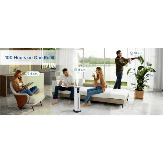 Levoit OasisMist Smart disponuje 10l nádobou na vodu a s výkonem 350ml/h hravě pokryje místnosti do velikosti až 55m2. Maximální doba provozu je až 100 hodin v závislosti na použitém programu zvlhčovače. Když voda dojde, zařízení se samo automaticky vypne, aby nedošlo k poškození a informuje vás také přes aplikaci v chytrém zařízení.
