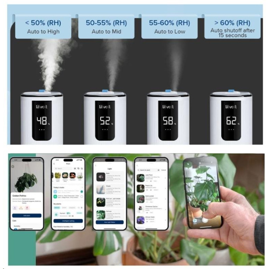 Díky funkci péče o rostliny v aplikaci VeSync a automatickému plánování bude péče o rostliny hračka. Aplikace pomůže identifikovat druh rostlin a doporučí plány zavlažování nebo hnojení podle vybraného druhu květin a rostlin.