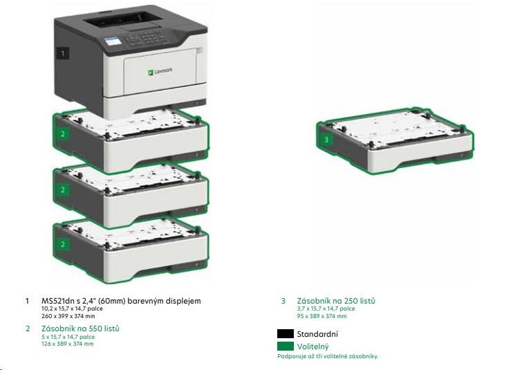 Obecné specifikace Část č. 36S0310 Technologie tisku Monochrome Laser Velikost pracovní skupiny Střední pracovní skupina Displej 2,4" (60mm) barevný LCD displej Podporované rozměry médií A6, Oficio, 7 3/4 Envelope, 9 Envelope, JIS-B5, A4, Legal, A5, Letter, Statement, Executive, Universal, DL Envelope, Folio, 10 Envelope Manipulace s papírem zahrnuta 100-Sheet Multipurpose Feeder, Integrated Duplex, Výstupní přihrádka na 150 listů, Integrovaný zásobník na 250 listů Standardní porty Gigabit Ethernet (10/100/1000), Port USB 2.0 Specification Hi-Speed Certified (typ B) Rozměry (V x D x Š) 260 x 399 x 374 mm Hmotnost 14.1 kg Rozměry balení (V x D x Š) 376 x 430 x 470 mm Hmotnost balení 15.99 kg Tisk Rychlost tisku 44 str./min.1 Rychlost tisku oboustranně) Až: černobíle: 22 str./min. (A4) Čas první stránky černobíle: 6.0 sekund Rozlišení tisku černobílého: 1200 x 1200 dpi, Kvalita 2400, 300 x 300 dpi, 600 x 600 dpi, Kvalita 1200 Duplexní oboustranný: Integrated Duplex Oblast tisku 4.0 mm od všech okrajů (včetně) Manipulace s papírem Podporované typy médií Papírové štítky, Tvrdý papír, Obyčejný papír, Transparencies, Envelopes, vinylové štítky, viz Card Stock & Label Guide Možnost dokončování No Počet vstupů papíru standardně: 2 maximálně: 5 Kapacita vstupu papíru standardně: 350 stránek maximálně: 2000 stránek 350 stránek Kapacita výstupu papíru Až: standardně: 150 stránek maximálně: 150 stránek Podporovaný rozsah gramáže papíru 60 - 120 g/m2 (standardní zásobník) 60 - 216 g/m2 (multifunkční zásobník) Doporučený měsíční objem tisku 2000 - 15000 stránek2 Maximální měsíční funkční cyklus 120000 stránek za měsíc3 Kazety a zobrazování Počty vytištěných stránek u kazet pro tiskárny až: 15,0004 -page High Yield Cartridge Kazeta na 6 0004 stran Extra vysokokapacitní kazeta na 20 0004 stran Ultra vysokokapacitní kazeta na 25 0004 stran Odhadovaný počet vytištěných stránek na zobrazovací válec Max.: 60000 stran při tisku 3 běžných stran/A4 na jednu tiskovou úlohu a při 5%pokrytí5 Tisková náplně dodávány s produktem První tonerová kazeta na 5 0000 stran, zařazená do vratného programu Náhradní kazety: Product functions only with replacement cartridges designed for use in a specific geographical region. See www.lexmark.com/regions for more details. Hardware Procesor 1.0 GHz MHz Paměť standardně: 512 MB maximálně: 512 MB Pevný disk Není k dispozici Jazyk tiskárny standardně: PCL 5e Emulation, PCL 6 Emulation, Microsoft XPS (XML Paper Specification), Personal Printer Data Stream (PPDS), PostScript 3 Emulation, PDF 1.7 emulation, Direct Image, AirPrint™ Fonty a znakové sady 2 PCL bitmap fonts, OCR-A, OCR-B scalable PCL 5e fonts, For more information, refer to the Technical Reference., 84 scalable PCL fonts, 91 škálovatelných PostScript fontů, 3 of 9 scalable PCL 5e fonts in Narrow, Regular and Wide, 5 PPDS bitmap fonts, 39 scalable PPDS fonts Dotykový displej No Možnosti připojení Přímé USB Ne Síť Ethernet Yes Bezdrátová Bezdrátové příslušenství Podpora síťových protokolů TCP/IP IPv6, TCP/IP IPv4, AppleTalk™, TCP, UDP Metody síťového tisku LPR/LPD, Pull Printing, Microsoft Web Services WSD, Secure IP (Port 96xx), FTP, TFTP, Enhanced IP (Port 9400), ThinPrint .print integration, IPP 1.0, 1.1, 2.0 (Internet Printing Protocol) Protokoly pro síťový management DHCP, APIPA (AutoIP), mDNS, IGMP, WINS, DDNS, SNMPv3, SNMPv1, SNMPv2c, Telnet, NTP, ICMP, HTTP, DNS, ARP, HTTPs (SSL6 /TLS), Finger Síťové zabezpečení SNMPv3, 802.1x Authentication: MD5, MSCHAPv2, LEAP, PEAP, TLS, TTLS Volitelné síťové porty Marknet N8370 WiFi Option Podporované operační systémy Podporované operační systémy Microsoft Windows Windows 10, Windows 8.1, Windows 8, Windows 8 x64, Windows 7 x64, Windows 8.1 x64, Windows 7 Podporované operační systémy Apple Apple OS X (10.6, 10.7, 10.8, 10.9, 10.10, 10.11, 10.12) Podporované operační systémy Linux Debian GNU/Linux 7.0, 8.0, Ubuntu 16.04 LTS, Fedora 23, 24, openSUSE Linux 42.3, Red Hat Enterprise Linux WS 6, 7, openSUSE Linux 13.2, SUSE Linux Enterprise Server 10, 11, 12 Citrix MetaFrame Microsoft Windows 2000 Server running Terminal Services with Citrix MetaFrame XP Presentation Server or Citrix MetaFrame Presentation Server 3.0., Microsoft Windows Server 2012 with Citrix XenApp 6.0, 6.5, Microsoft Windows 2000 Server running Terminal Services with Citrix Presentation Server 3.0, 4.0, Microsoft Windows 2000 Server running Terminal Services with Citrix Presentation Server 4.0 Podporované operační systémy Novell Novell Open Enterprise Server on SUSE Linux Enterprise Server, Novell NetWare 5.1(SP 6+), 6.0(SP 3+) with Novell Distributed Print Services (NDPS), Novell Open Enterprise Server 2 SP2 on SuSE Linux Enterprise Server 10 SP3 3, Novell NetWare 6.5 Open Enterprise Server, Novell Open Enterprise Server 11 on SUSE Linux Enterprise Server 11, Novell Open Enterprise Server 2 on SUSE Linux Enterprise Server 10 SP4 Podporované operační systémy UNIX Sun Solaris x86 10, 11, Sun Solaris SPARC 10, 11, IBM AIX 6.1, 7.1 Elektrické napájení a provoz ENERGY STAR Yes Obvyklá spotřeba energie podle standardu Energy Star 1.8 kilowatthodin za týden Hlučnost / Hlučnost v činnosti 14 dB (nečinná) 56 dB (Tisk) Hlučnost při oboustranném tisku pracovní režim: 55 dB Průměrná spotřeba v režimu hibernace / Průměrná spotřeba v režimu spánku / Průměrná spotřeba energie v režimu Připravena / Průměrná spotřeba energie při tisku 0.1 watts 2.0 watts 8 watts 620 watts Předepsané provozní podmínky Vlhkost: 8 až 80% relativní vlhkosti Teplota: 16 až 32°C Nadmořská výška: 0 - 5000 metrů Certifikace produktu ENERGY STAR, ICES-003 Class B, BSMI Class B, VCCI Class B, US FDA, UL 60950-1, FCC Class B, cUL CAN/CSA-C22.2 60950-1, NOM, CB EN/IEC 60950-1, 