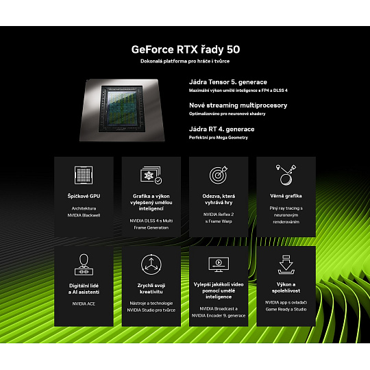 Ray tracing, DLSS 4 s Multi Frame Generation, NVIDIA Reflex pro snižení odezvy (zejmena v kompetitivnich hrach), 12 GB GDDR7 paměti – kombinace, která rozdrtí i nejnáročnější herní tituly. Tato karta přináší plynulý obraz ve vysokém rozlišení, ať už hraješ kompetitivní tituly ve 144Hz, nebo si užíváš příběhové hry na maximální detaily. Přetaktovaná edice OC navíc přináší extra výkon navíc!