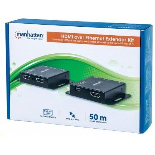 Ideal for trade shows, classrooms, home theater, conference rooms, business office and retail applications, the Manhattan 1080p HDMI over Ethernet Extender Kit boosts and extends a 1080p signal up to 50 m (164 ft.) for convenient display or projector placement. Ethernet cabling — Cat6 UTP, SSTP or SFTP (cables not included) — is less expensive and easier to install than HDMI cabling and in-line signal repeaters, and, when used with our Extender Kit, delivers a clear, sharp and vivid picture over longer distances.