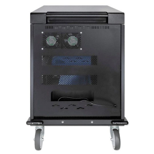 Vestavěné AC zásuvky v PDU na zadní straně jednotky usnadňují nabíjení zařízení, jako jsou notebooky, notebooky, tablety, telefony a mnoho dalších pomocí jejich napájecích adaptérů nebo nástěnných nabíječek. Správci mají pohodlný přístup přes dvířka na zadní straně jednotky, aby se mohli zapojit do zásuvek a přivést kabely k zařízením v přední části.