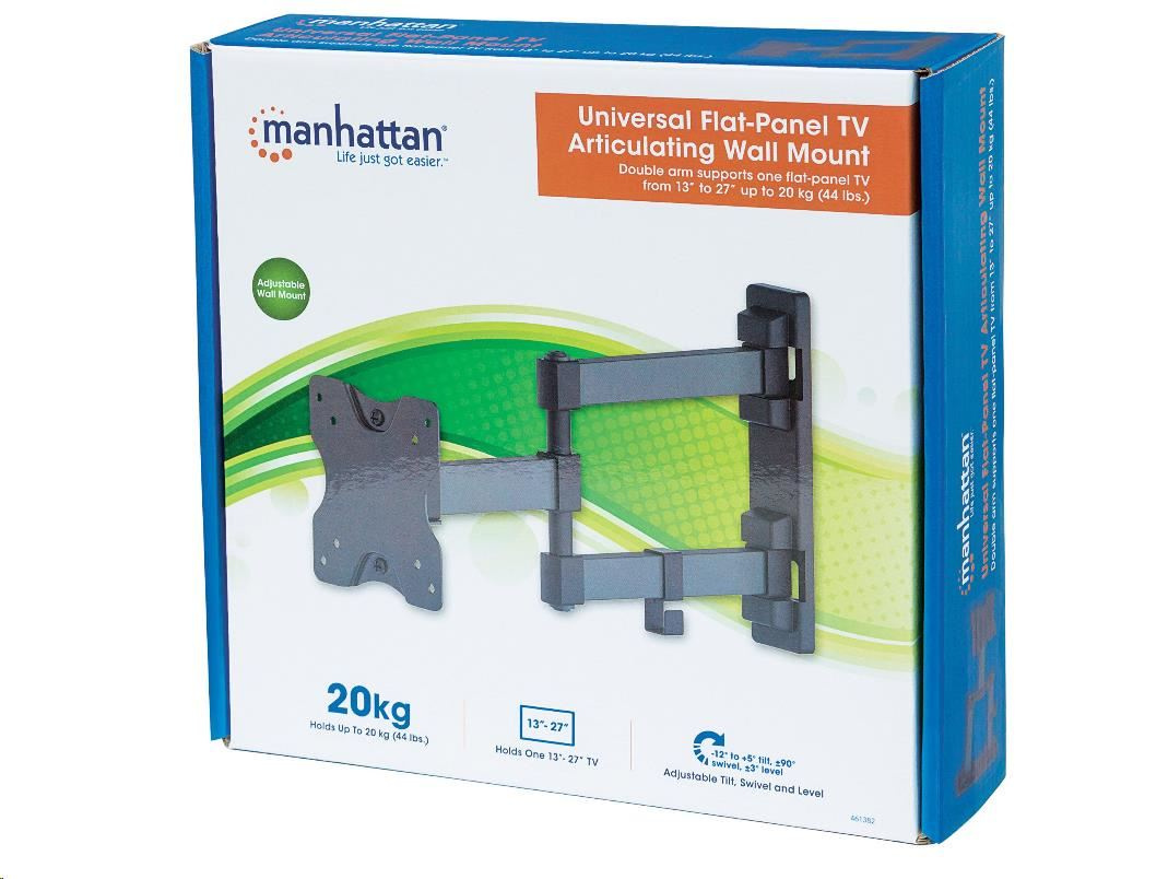 Overcome an odd floor plan, annoying glare or awkward furniture placement that can limit your flat-panel TV experience. The Manhattan Universal Flat-Panel TV Articulating Wall Mount folds nearly flat against the wall and safely extends on a strong, double-arm frame that helps you achieve prime viewing positions from almost anywhere in the room. VESA-compliant and constructed of quality materials, this articulating wall mount fits a range of display sizes for a secure and confident above-the-floor TV installation. It's the perfect fit for mounting a TV in your living room, bedroom or den, as well as for commercial uses in hotels, classrooms, conference rooms, for digital signage and more. The Manhattan Universal Flat-Panel TV Articulating Wall Mount brings your TV enjoyment front and center.