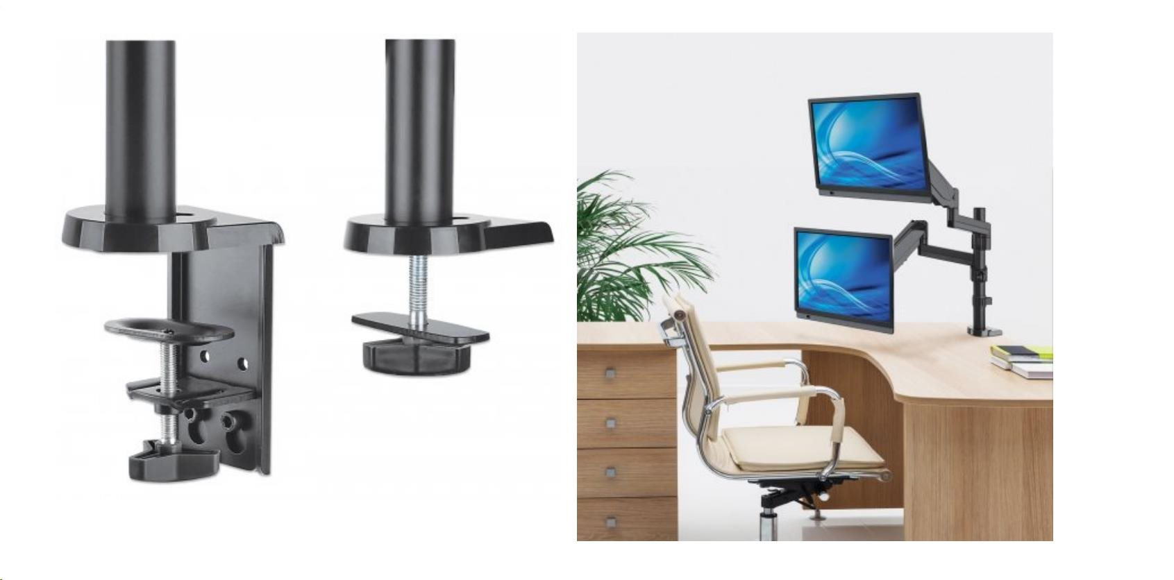 The Manhattan Universal Gas Spring Dual Monitor Mount securely supports two 17" to 32" TVs or monitors. Because it uses gas springs to hold your displays, the arms only need the lightest touch to move them to the best viewing angles for your purposes. The mount's high-quality aluminum and steel construction will provide years of reliable service. Ideal for installation on a large desk, the Manhattan Universal Gas Spring Dual Monitor Mount lets you take advantage of the extra range of movement so you can have more space to get work done.