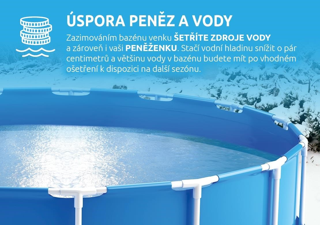 Zazimováním bazénu venku se šetří vodní zdroje a zároveň snižují náklady na vodné a stočné. Vhodně ošetřená bazénová voda vydrží do další koupací sezóny a nebude potřeba bazén znovu kompletně napouštět.