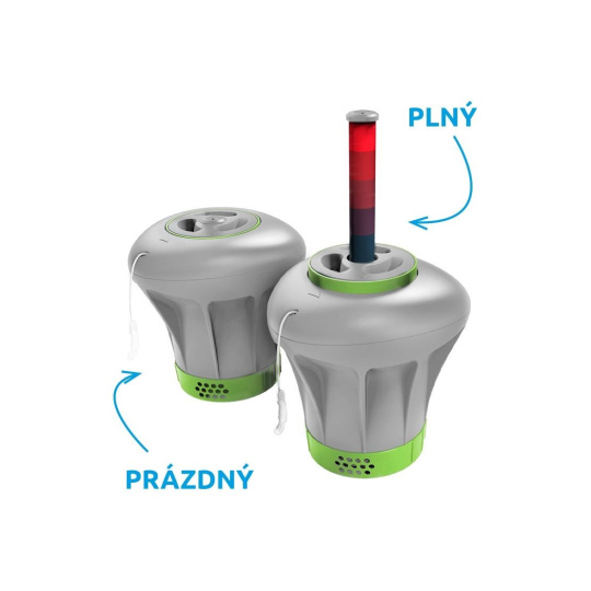 Velký dávkovač chloru má integrovaný barevný ukazatel, který vás upozorní na potřebu doplnit nové tablety. Indikátor postupně klesá, když se chemikálie rozpustí.
