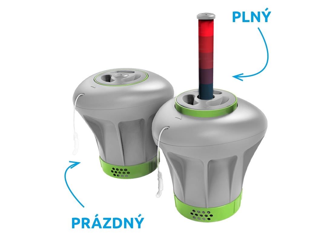 Velký dávkovač chloru má integrovaný barevný ukazatel, který vás upozorní na potřebu doplnit nové tablety. Indikátor postupně klesá, když se chemikálie rozpustí.