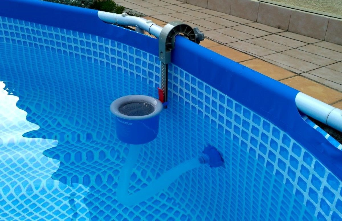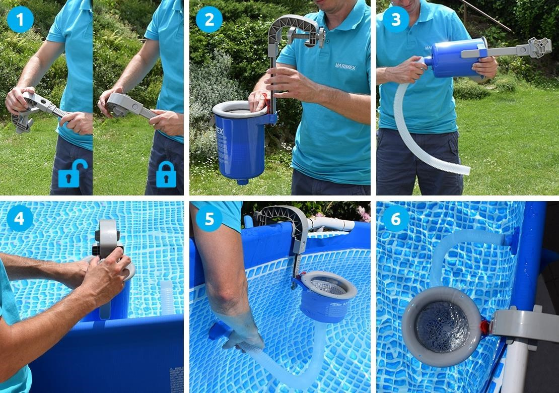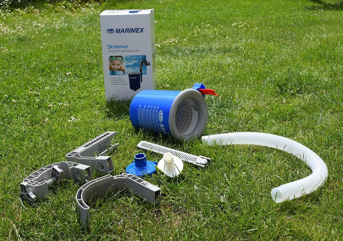 Skimmer pro sběr nečistot z hladiny bazénu. Skimmer se napojí na průchod stěnou bazénu pomocí šroubového adaptéru a hadice a zavěsí se na stěnu nebo límec bazénu. V balení jsou adaptéry pro zavěšení na bazény s nafukovacím lemem a na bazény s kovovým rámem. Montáž je velmi jednoduchá a zvládne ji prakticky každý. Díky skimmeru se z hladin stahují nečistoty, které potom zachytí filtrace.