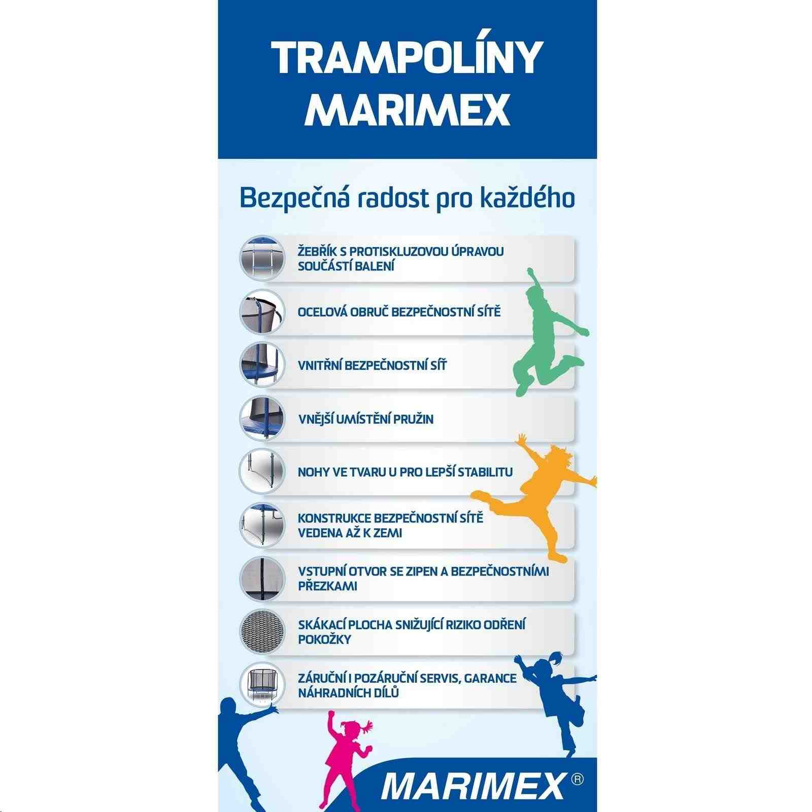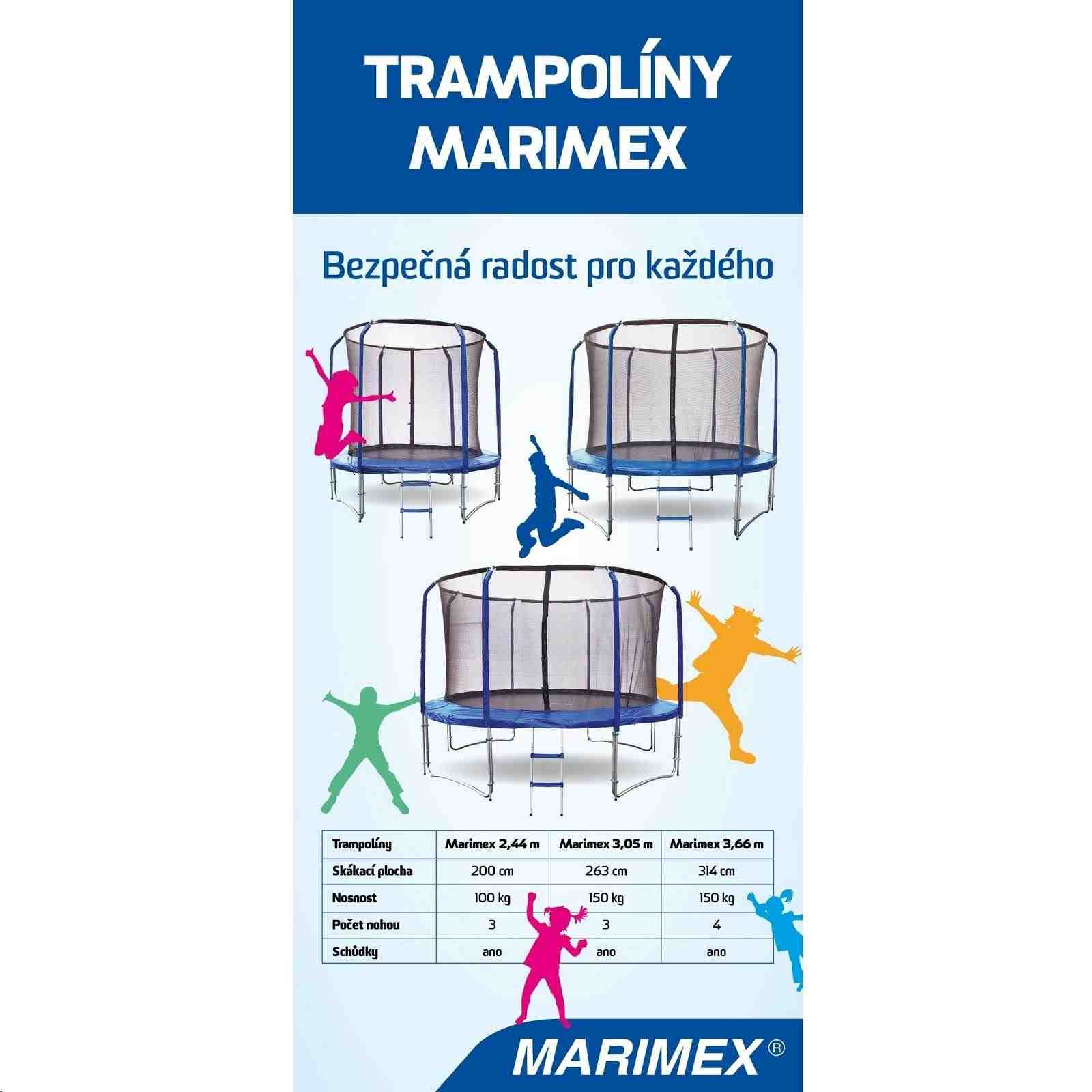 Trampolína Marimex Standard je skvělým doplňkem každé zahrady. Děti skákání na trampolíně milují a při skákání si snadno zacvičí i dospělí - nosnost je až 150 kg. Dokonalou stabilitu zajišťují tři nohy ve tvaru písmene U.