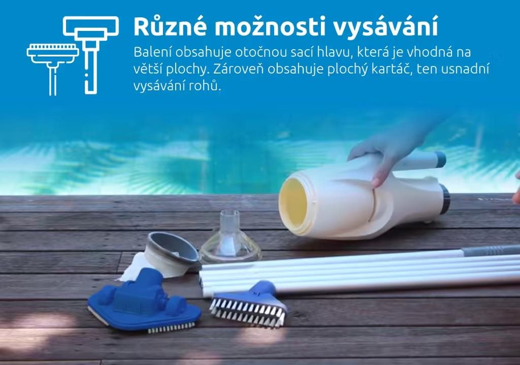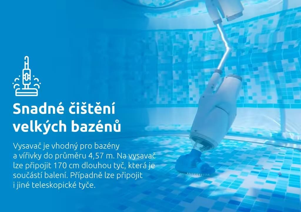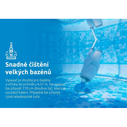 je vhodný pro bazény do průměru 4,57 m. Je možné ho použít i pro vířivky. Na vysavač lze připojit 170 cm dlouhou tyč, která je součástí balení. Případně je možné připojit i jiné teleskopické tyče. Vysavač jednoduše vyčistí dno, či stěny. Díky tomuto vysavači si budete po celou koupací sezónu užívat křišťálově čisté vody se vším všudy.