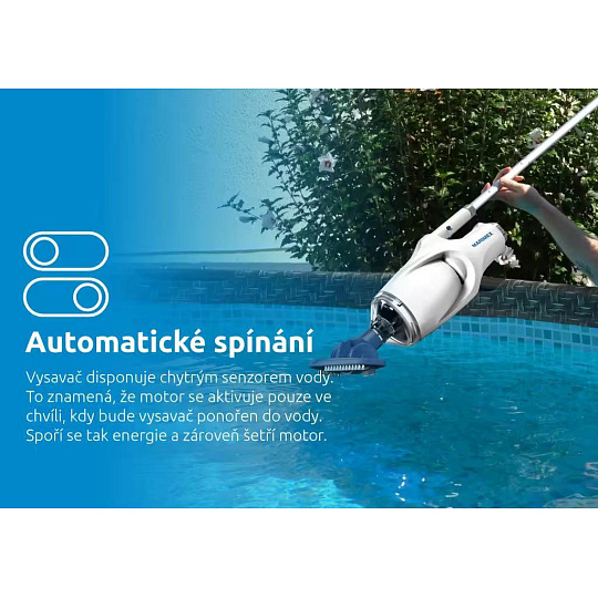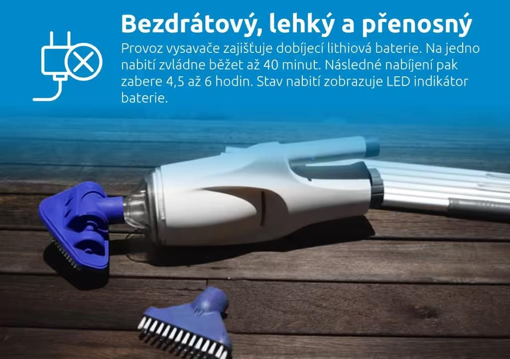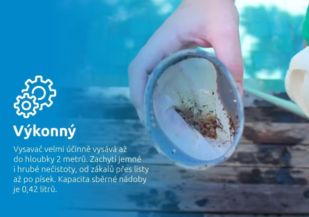 Vysavač velmi účinně vysává až do hloubky 2 metrů. Zachytí jemné i hrubé nečistoty, od zákalů přes listy až po písek. Nečistoty se zachytávají ve filtru, ze kterého se po vysávání snadno vysypou ven. Kapacita sběrné nádoby je 0,42 litrů. Balení vysavače obsahuje otočnou sací hlavu, která je vhodná na větší plochy. Zároveň obsahuje plochý kartáč, ten usnadní vysávání rohů.