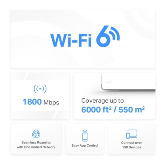 - Pokrytí celé domácnosti – pokrytí prostoru až 550 m2 (6 000 čtverečních stop) vysokorychlostní sítí Wi-Fi, která eliminuje mrtvé zóny Wi-Fi pokrytí ve vaší domácnosti.