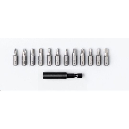 12 vysoce kvalitních bitů z legované oceli S2 s dvojitou antikorozní vrstvou, s tvrdostí až 60 HRC, zajišťující dlouhodobé používání. Prodlužovací tyč je ideální na používání v těsných nebo těžko dostupných místech.