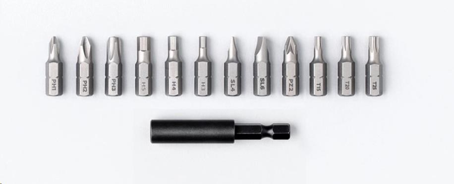 - Obsah balení: 1x Šroubovák, 1x Úložný vak, 1x Manuál, 1x Zásobník bitů, 1x Prodlužovací tyč, 12x Bit, 1x Nabíjecí kabel