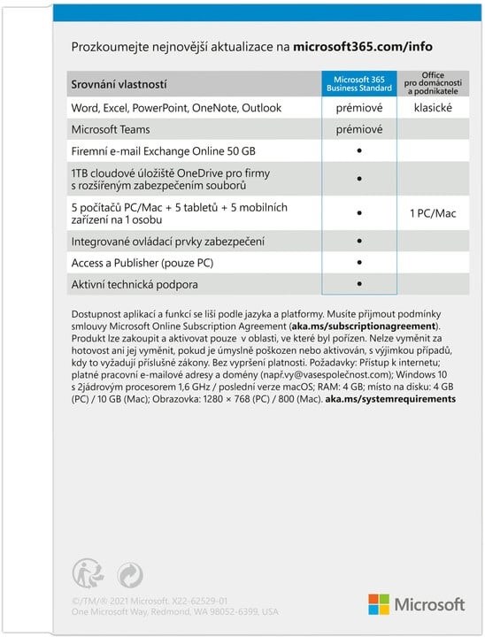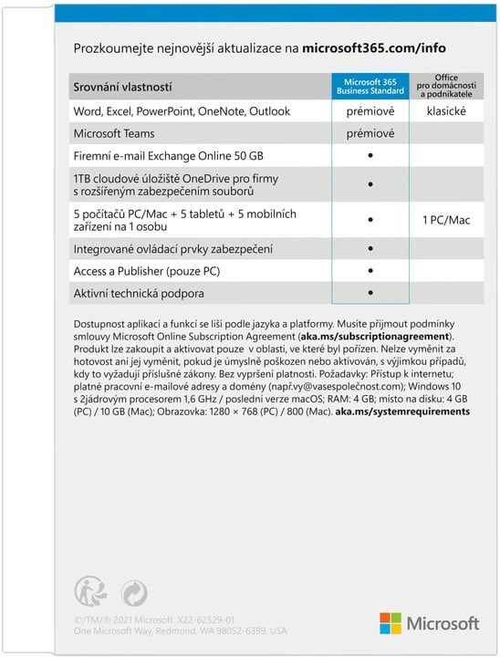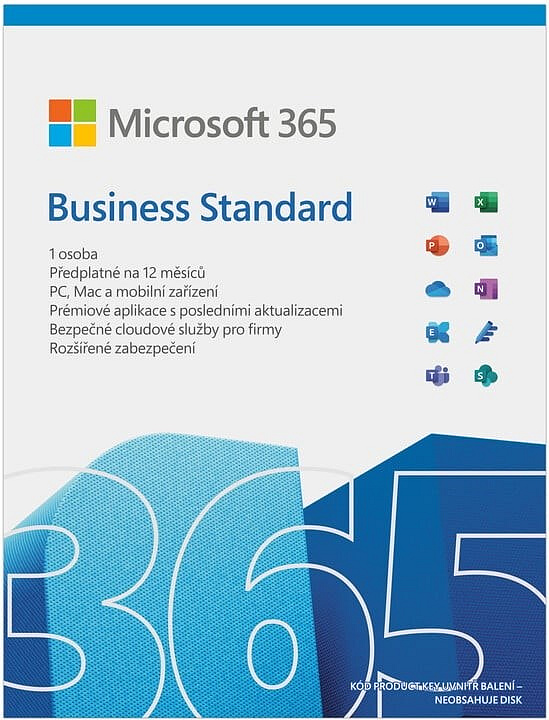 Předplatné sady aplikací a služeb Microsoft 365 Business Standart obsahuje prémiové kancelářské aplikace Word, Excel, PowerPoint, Outlook, OneNote, Access (pouze PC), Publisher (pouze PC), Teams, Exchange, SharePoint a prvotřídní firemní služby spolu s funkcemi pro zabezpečení a dodržování předpisů. Součástí je také přístup na cloudové úložiště OneDrive s kapacitou 1 TB a nechybí ani funkce Osobní trezor a rozšířené možnosti zabezpečení. Funguje v systémech Windows, Mac, iPadOS, iOS a Android. Elektronická licence doručená emailem na 1 rok pro 1 uživatele na 5 počítačích, 5 mobilních zařízeních a 5 noteboocích.