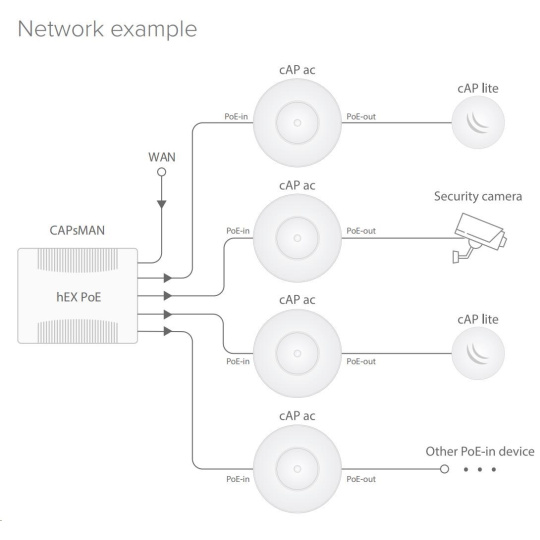 cAP ac je dual-bandové AP (2.4+5GHz) s podporou napájení PoE dle standardu 802.3af/at. Disponuje dvěma gigabit.ethernet porty z nichž první slouží jako vstup napájení (podporuje aktivní PoE 802.3af/at) a druhý jako výstup pro další jednotku (podporuje pouze pasivní PoE až do 57V). Tedy přestože jednotka podporuje režim repeater je možné další AP připojit i ethenet.kabelem do portu 2 kde bude napájeno pasivním PoE, případně může být připojena IP kamera či jiné IP zařízení podporující napájení pasivním PoE.