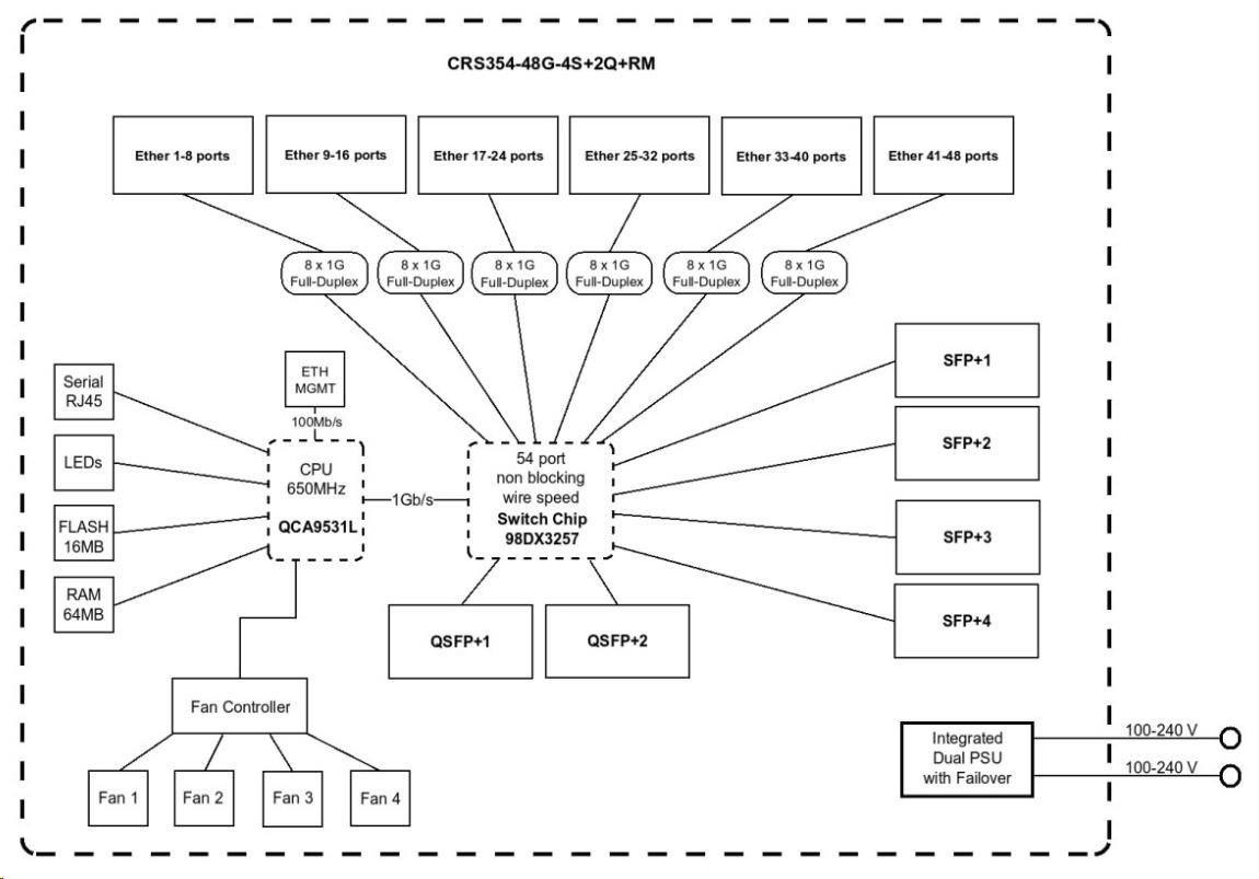 CRS354-48P-4S+2Q+RM is extremely functional, and it has the best price-point on the market – it will make the perfect addition to a professional setup. The total non-blocking throughput is 168 Gbps, switching capacity is 336 Gbps and the forwarding rate reaches 235 Mpps