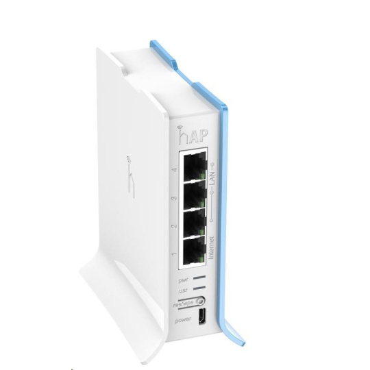 hAP lite je nový router (AP) určený zejména do domácností a malých kanceláří. Nábízí 2.4GHz WiFi se standardy 802.11 b/g/n s tlačítkem WPS pro snadné připojení klientů bez znalosti hesla. Procesor je taktován na 650MHz a sekunduje mu 32MB RAM operační paměti typu DDR. K dispozici jsou celkem čtyři ethernetové porty 100Mbps s Auto-MDI/X. Napájení probíhá skrz microUSB port, který slouží čistě k tomuto účelu nikoliv pro data. Napájecí adaptér je součástí balení.