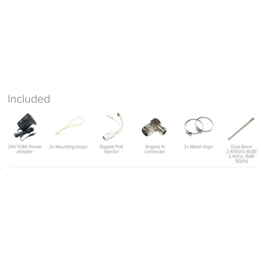 Balení obsahuje: RouterBOARD GrooveA-52HPn, PoE injektor, napájecí zdroj, montážní sada (o-kroužky), pravoúhlou N spojku a všesměrovou anténu 6dBi .