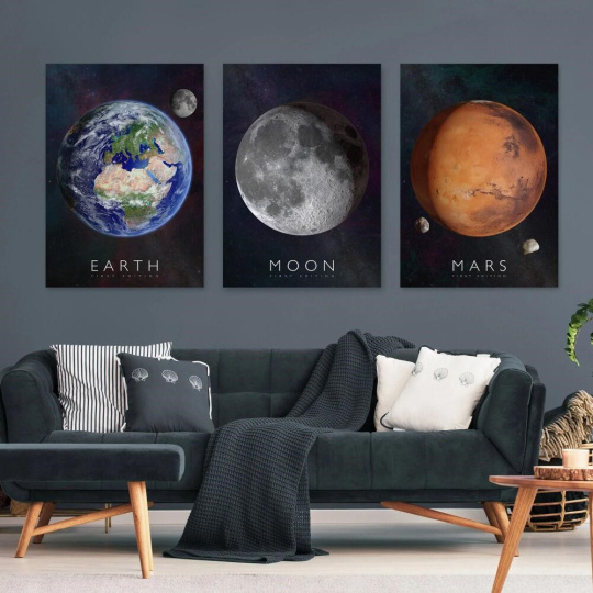 Balení obsahuje 3 plakáty: Země, Měsíc a Mars. Plakáty jsou vytištěny na odolném papíře ve velikosti A1 (594 × 841 mm).