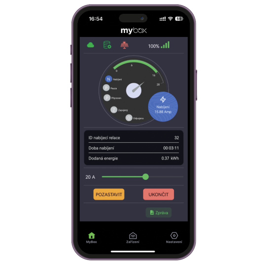 Díky nativní aplikaci MyBox získáte přístup ke stanici odkudkoliv. Budete ji vzdáleně ovládat i monitorovat. Po propojení s fotovoltaickou elektrárnou pak využijete i přebytky energie.