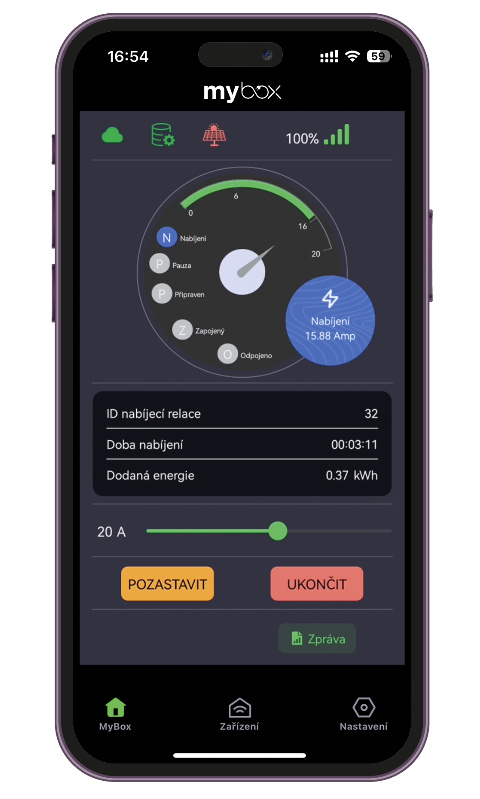 Díky nativní aplikaci MyBox získáte přístup ke stanici odkudkoliv. Budete ji vzdáleně ovládat i monitorovat. Po propojení s fotovoltaickou elektrárnou pak využijete i přebytky energie.