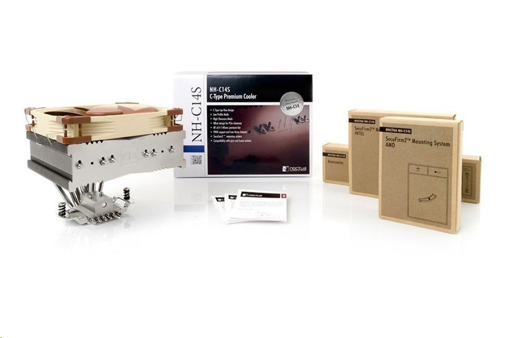 Chladič NH-C14S je nástupce výborného chladiče NH-C14 a představuje špičku ve své kategorii. NH-C14S je top-flow chladič CPU, který je extrémně účinný, vysoce kompatibilní a pozoruhodně nastavitelný. Díky hlubšímu žebrování a renomovanému větráčku NF-A14 PWM poskytuje jedno-větráčkový NH-C14S stejný, tichý chladící výkon jako jeho dvou větráčkový předchůdce, přičemž je ještě univerzálnější. S větráčkem, který je připevněn na vršku žebrování, je chladič kompatibilní s moduly RAM do výšky 70 mm. Pokud je větráček připevněn pod žebrováním je výška chladiče pouhých 115 mm, tudíž je vhodný pro použití ve většině HTPC skříních. Současně nové posunuté uspořádání umožňuje uvolnit vrchní PCIe slot u většiny základních desek typu µATX a ATX. Chladič je vybaven montážní sadou SecuFirm2™ pro mnoho typů patic.