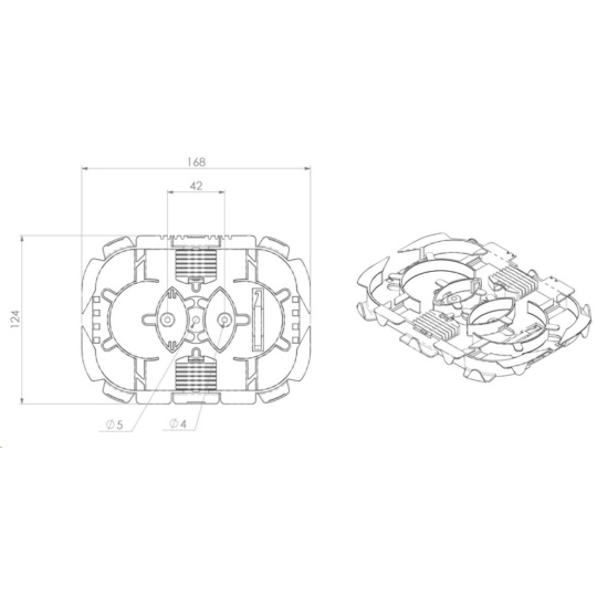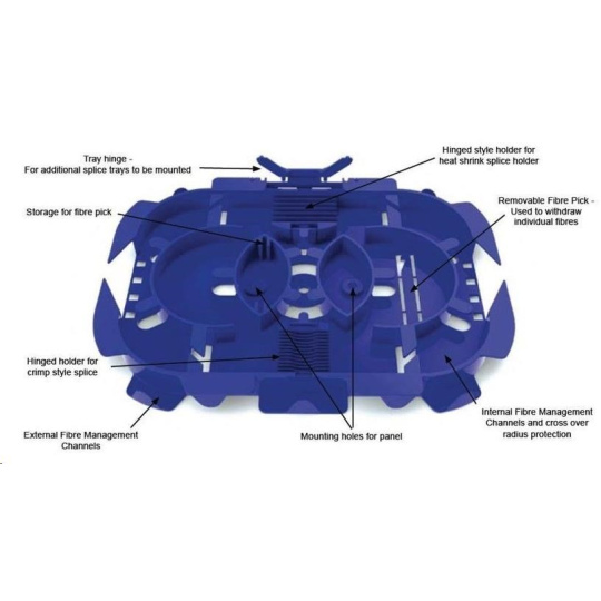 - dva hřebínky, pro celkovou kapacitu 24 ochran svárů. (Uchycení a konstrukční řešení výklopných hřebínků umožňuje vedení vláken i pod nimi)