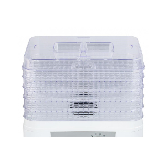 Sušička potravin s pěti nastavitelnými mřížkami, vysoceúčinný ohřívač a ventilátor zajišťují důkladnou cirkulaci vzduchu pro rychlé a efektivní vysušování, jednoduché ovládání pomocí otočného ovladače teploty, rozsah nastavitelné teploty od 35 ° C do 70 ° C, bezpečnostní pojistka, napájení 230V ~ 50Hz, 230W, šířka: 320 mm, výška: 270 mm, hloubka: 255 mm.