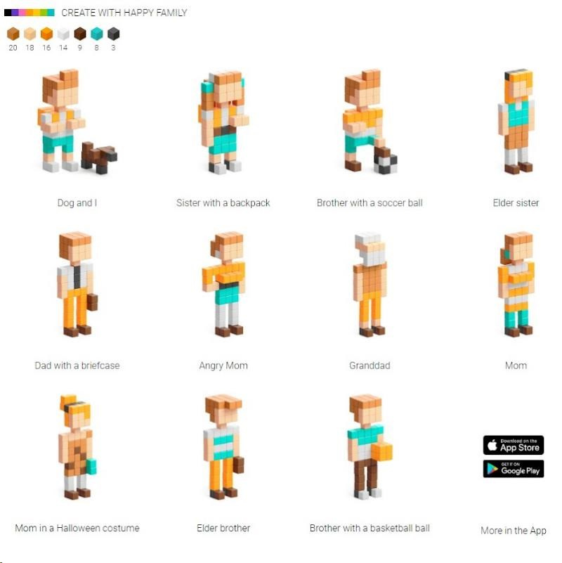 PIXIO Happy Family obsahuje 88 bloků PIXIO v 7 barvách. Umožní oživit vaše kreativní nápady a