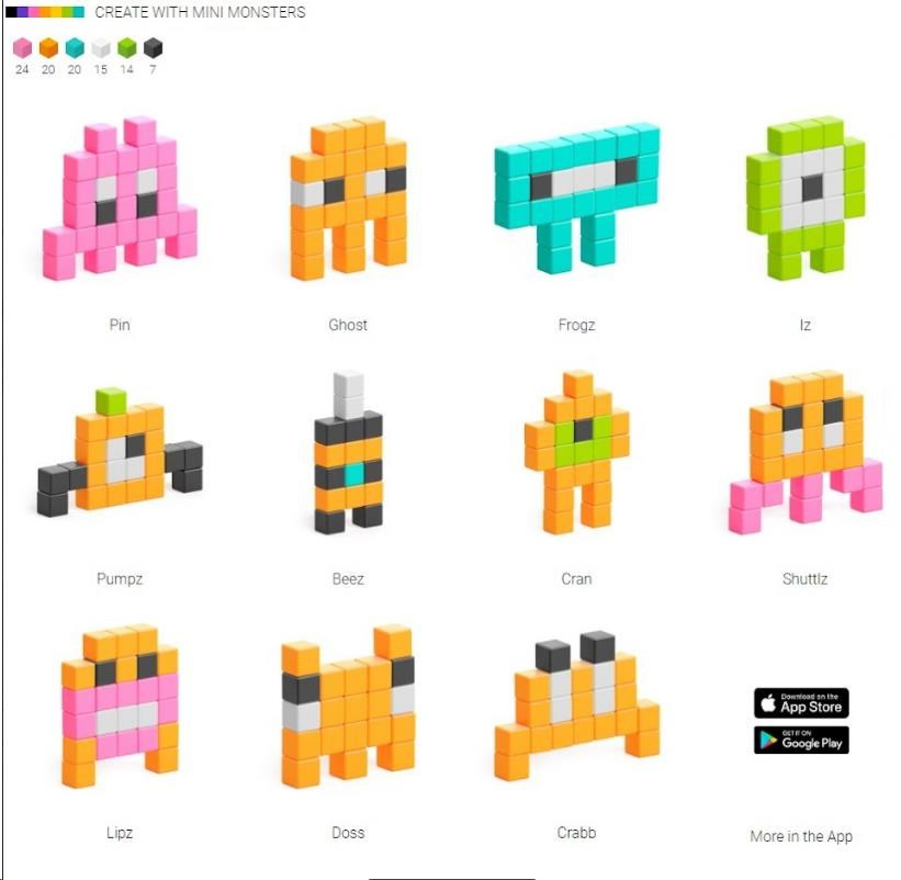 Řada PIXIO Mini Monsters obsahuje 100 bloků PIXIO v 6 barvách. Umožní oživit vaše kreativní