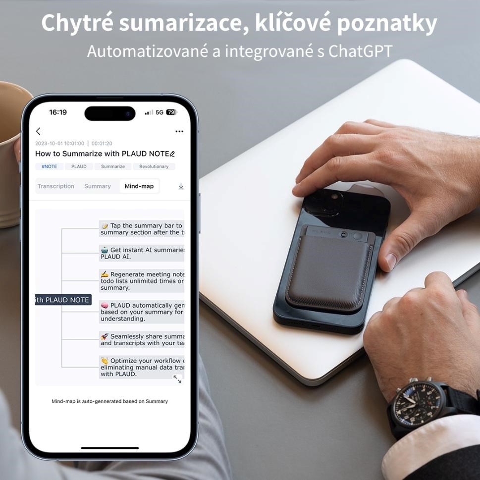 Plaud Note je AI hlasový záznamník, který vám s pomocí ChatGPT nástrojů podstatně usnadní život. Záznamník má minimalistický design oceněný cenou Red Dot za výjimečný design a minimalistické jsou i jeho rozměry – je velký jako platební karta. Záznamník podporuje 57 jazyků včetně češtiny a slovenštiny. Plaud Note nabízí duální režim nahrávání, a to pro diktování poznámek a druhý pro nahrávání hovorů. Díky vestavěnému 64GB úložišti můžete na Plaud Note nahrát až 480 hodin záznamu a jeho energetická nenáročnost zajistí 30 hodin kontinuálního záznamu a 60 dní pohotovostního režimu. Naprosto výjimečné je u osobních záznamníků propojení Plaud Note s ChatGPT. Díky aplikaci Plaud pak můžete nechat nadiktované záznamy přepsat, tvořit z nich shrnutí, a dokonce nechat AI vytvořit, dnes velmi populární, myšlenkové mapy. V ceně produktu je navíc zahrnuto cloudové úložiště pro 10.000 minut záznamu. Služba PLAUD AI Membership má dvě varianty. Starter a Pro. Starter nabízí téměř všechny funkce, obsahuje 300 minut transkripce záznamu a je zdarma. Verze pro nabídne 1200 minut přepisu, rozšířený výběr šablon, a navíc prioritní přístup k chystaným funkcím jako je například rozeznání osoby nebo překladač. Aktuální cena služby pro je 249 Kč na měsíc* při účtování měsíčně, nebo 1990 Kč ročně*. Další z neplacených funkcí, které dělají ze spolupráce s Plaud Note je AI procesing, zajišťující eliminaci ruchu na pozadí. Funkci lze aktivovat i dodatečně, po vytvoření záznamu a lze ji nastavit ve třech intenzitách pro každou příležitost. Poznámky tak můžete v klidu diktovat i na rušné ulici a výsledkem bude jen váš, izolovaný hlas. Záznamník se ovládá fyzickým tlačítkem s haptickou odezvou a fyzickým přepínačem režimů. Záznam začíná i končí jedním stiskem tlačítka, tak jednoduché to je. (*cena předplatného aktuální 20.5.2024)