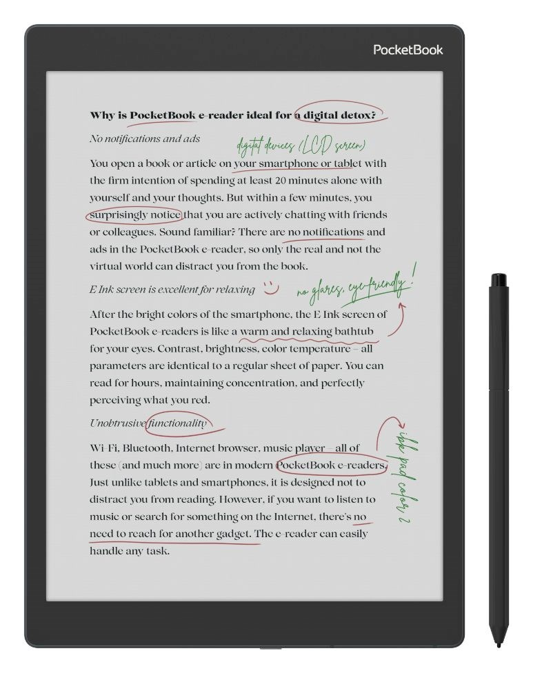 - Velký barevný displej 10,3” E Ink Kaleido™ 3, bezpečný pro oči