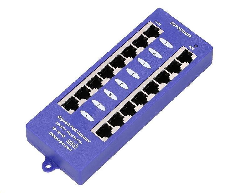 Panel integrující osm gigabitových pasivních POE injektorů s napájecím rozsahem 12-57V a max. proudem 1000mA/port.Univerzální řešení pro vzdálené napájení většího počtu aktivních prvků s integrovaným extraktorem po UTP kabeláži.
