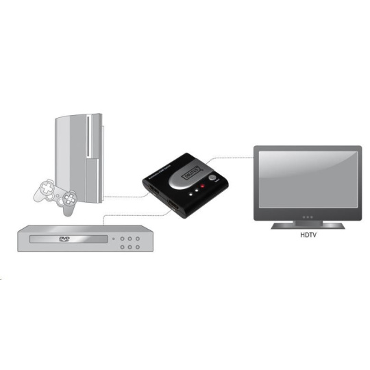 HDMI Switch 2 ->1 automatický 2 HDMI zařízení sdílejí 1 HDMI zařízení (obrazovku). Výběr zařízení je buď automaticky nebo tlačítkem. Podpora 20m HDMI kabelu na vstupu, až 25m HDMI kabelu na výstupu HDMI Switche. Podpora 3D HDMI rolišení 480i, 480p, 720i, 720p,1080i a 1080p Podpora modů VGA,SVGA,XGA,UXGA mode HDMI 1.3b 8bit,10bit,a 12bit barevná hloubka na kanál Výběr vstupu tlačítkem / automaticky. Plug-and-play, není třeba software. - HDCP kompatibilní V balení: 1x HDMI switch 1x 0.5m propojovací HDMI kabel.