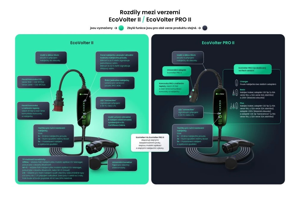 Nový EcoVolter & EcoVolter PRO druhé generace přináší širokou škálu možností. Ať už potřebujete jednoduché offline řešení, nebo profesionální fleetové řešení s LTE připojením a MID certifikovaným měřením pro fakturaci či přesné měření spotřeby. EcoVolter II & EcoVolter PRO II se plně přizpůsobí Vašim potřebám – vyberte si mezi variantami 11kW nebo 22kW. Pořiďte si klidně Offline verzi. Pokud v průběhu užívání zjistíte, že potřebujete připojení přes Wi-Fi, jednoduše přikoupíte konektivitu v naší mobilní aplikaci EV-Manager a můžete nadále používat stejný přenosný Wallbox a využívat mnohem více funkcí.