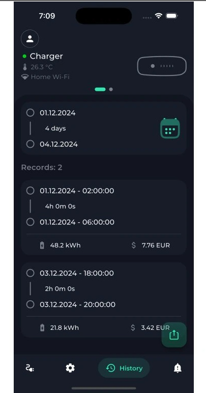 - exportování historie nabíjení